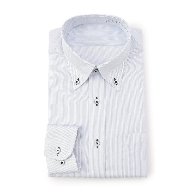 1枚でもおしゃれなストライプ柄、ボタンホールの配色糸もアイキャッチなデザインです。