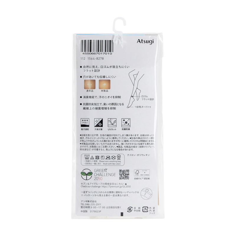 消臭機能、抗菌防臭加工、UV対策加工、口ゴムが目立ちにくいフラット設計、ヌードトゥ