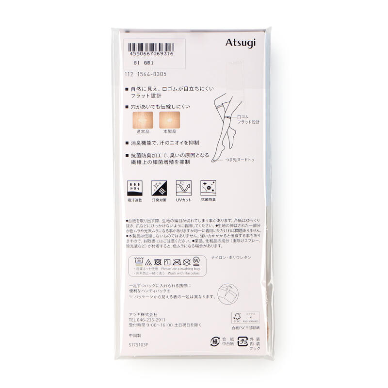 消臭機能、抗菌防臭加工、UV対策加工、口ゴムが目立ちにくいフラット設計、ヌードトゥ