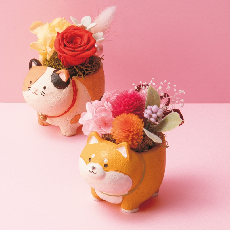 ●柴犬(プリザーブドフラワー(千日紅・アジサイ・カスミソウ)、造花、樹脂製器)