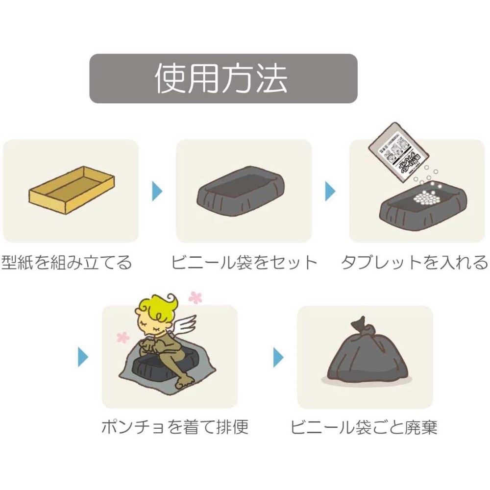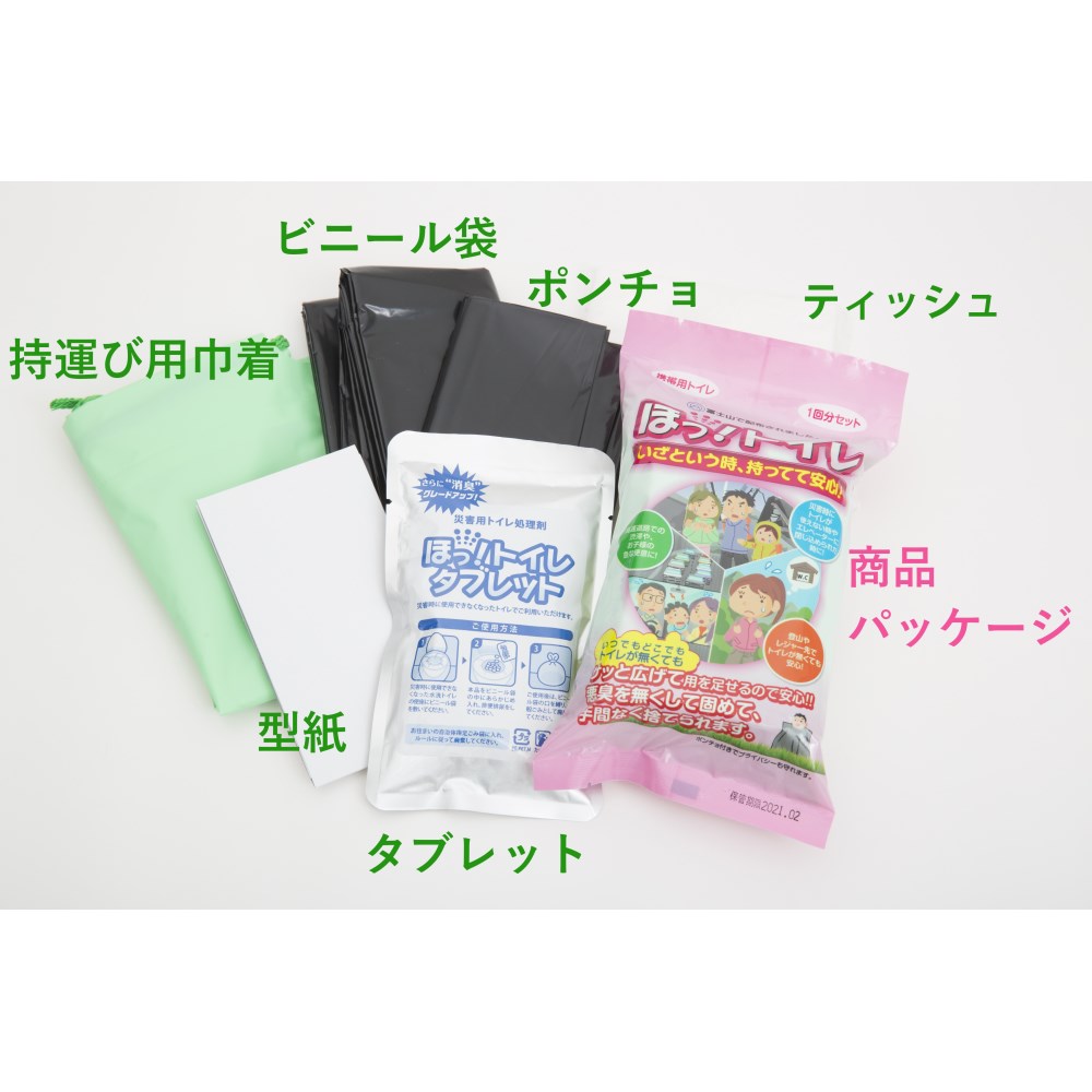 トイレキット・ポンチョ・ティッシュが付属されているタブレットタイプの携帯トイレ。