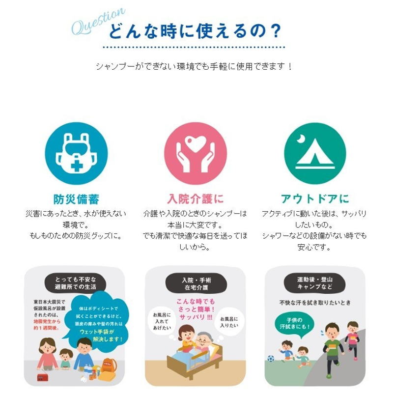 断水時やアウトドアなど、水が使えないときでも、頭皮を清潔に保てます。