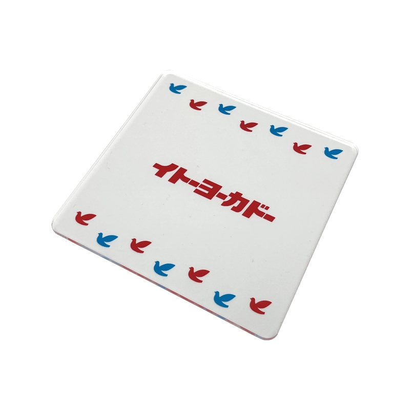 ・小さなハトが上下の帯となりヨコ配置のロゴをプリントした、アクリルコースターです。