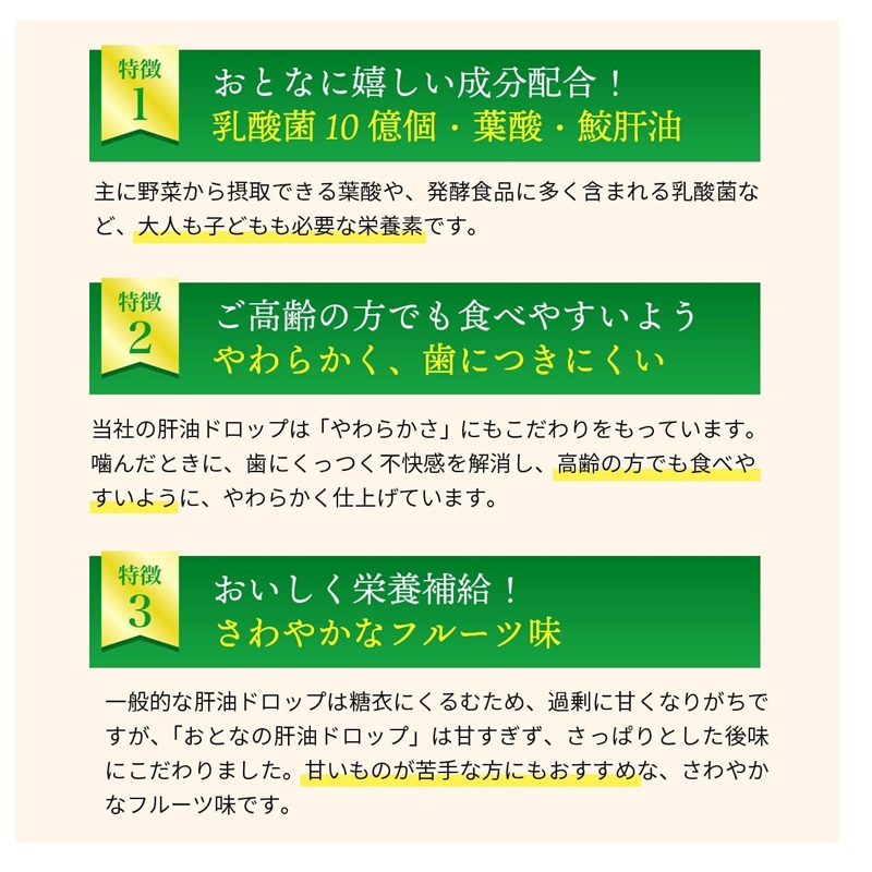 おとなの肝油ドロップ同様、ビタミンD・ビタミンCはもちろん、葉酸や乳酸菌に加え、本物のサメ肝油エキスも配合しています。