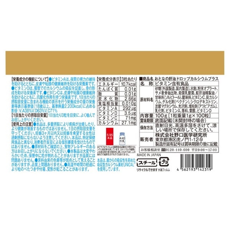 おとなの肝油ドロップ同様、ビタミンA・ビタミンD・ビタミンCはもちろん、葉酸や乳酸菌に加え、本物の鮫肝油精製油も配合して