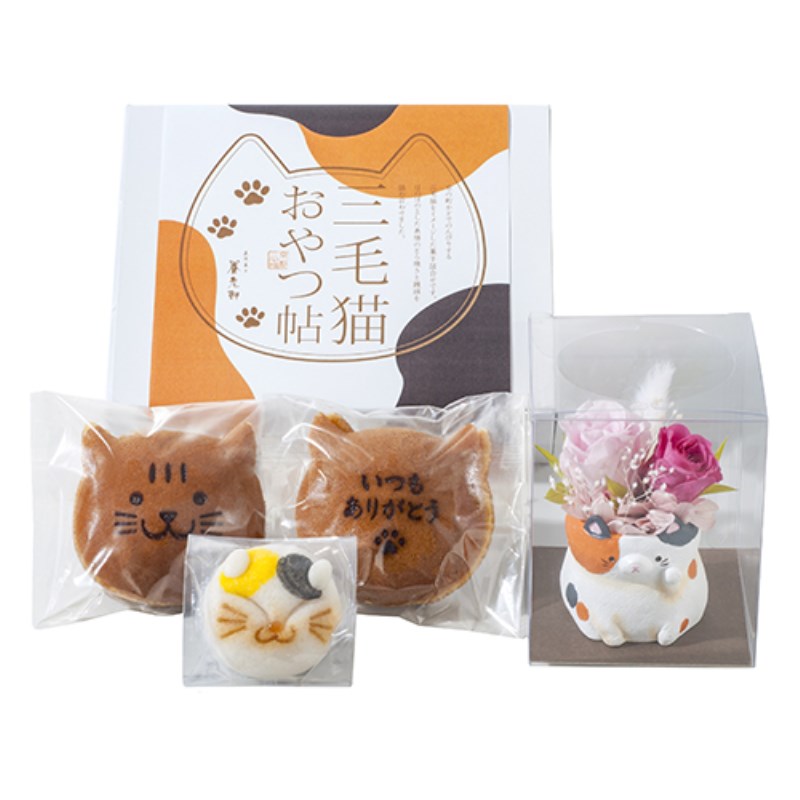 猫どら焼き(小豆あん・しろあん×各1)、三毛猫饅頭×1、猫ポットプリザーブドフラワー