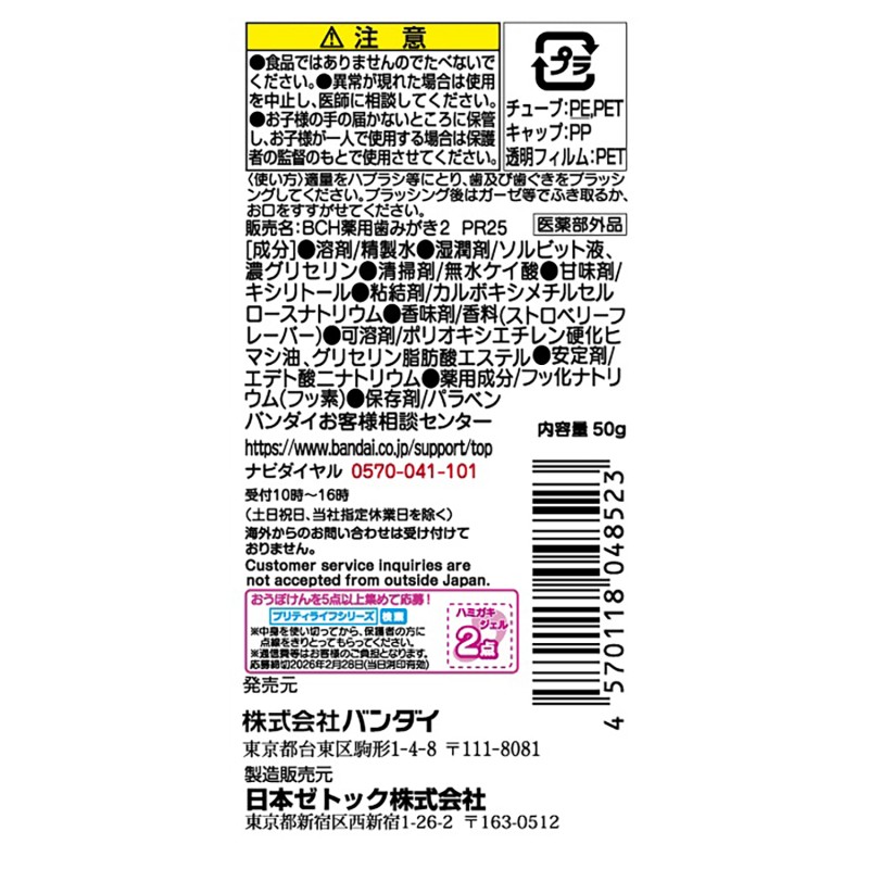 - 溶剤、精製水、湿潤剤、ソルビット液、濃グリセリン、清掃剤、無水ケイ酸、甘味剤、キシリトール、粘結剤、カルボキシメチルセル