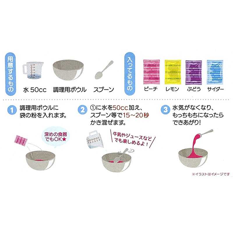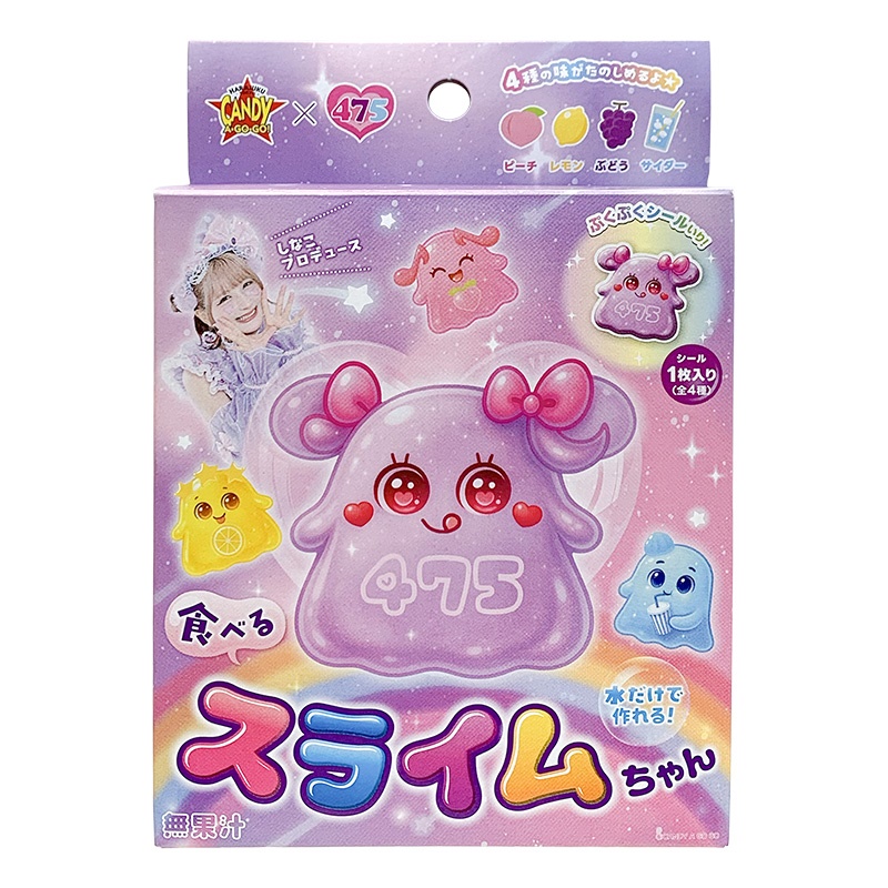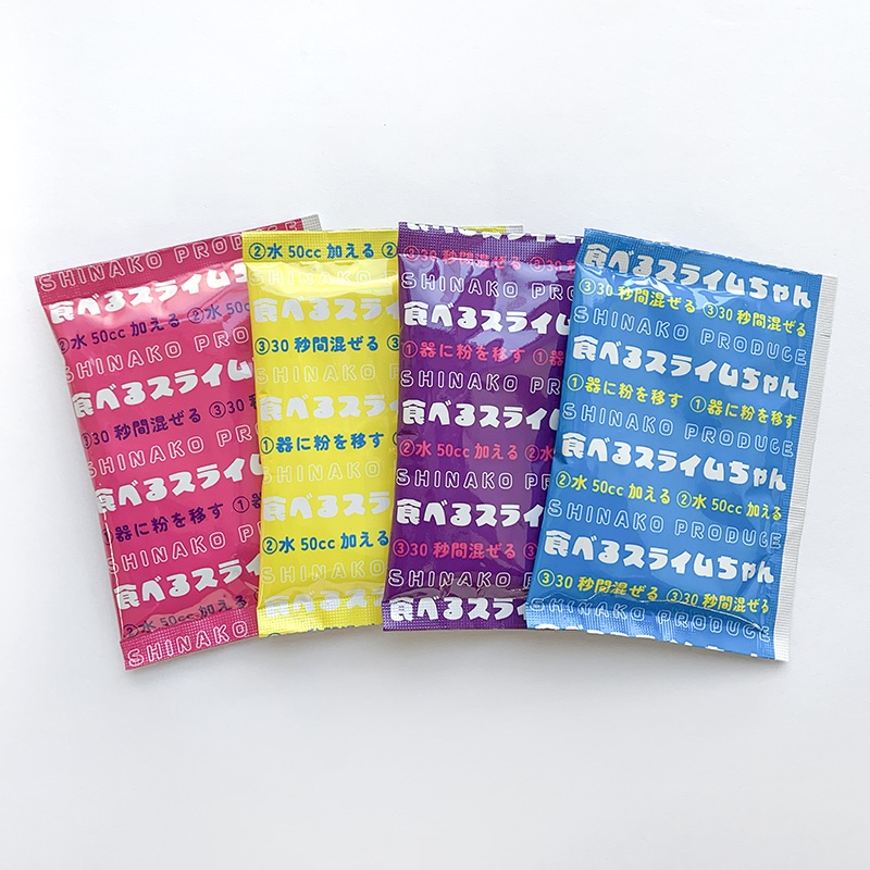 ピーチ・レモン・ソーダ・ぶどうの4種類がセットになっているから色々な色の食べるスライムが完成するよ。