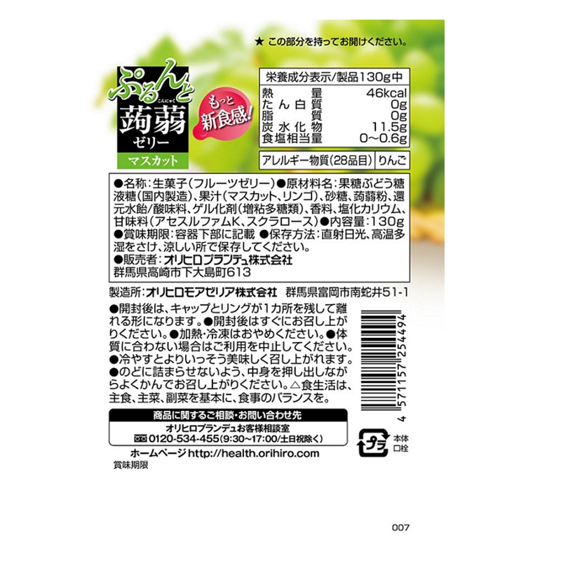蒟蒻粉配合でぷるんとした食感と、みずみずしい果物感も楽しめる、0kcalの美味しいシャインマスカット味の蒟蒻ゼリーです。