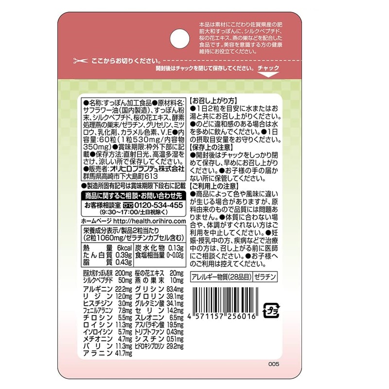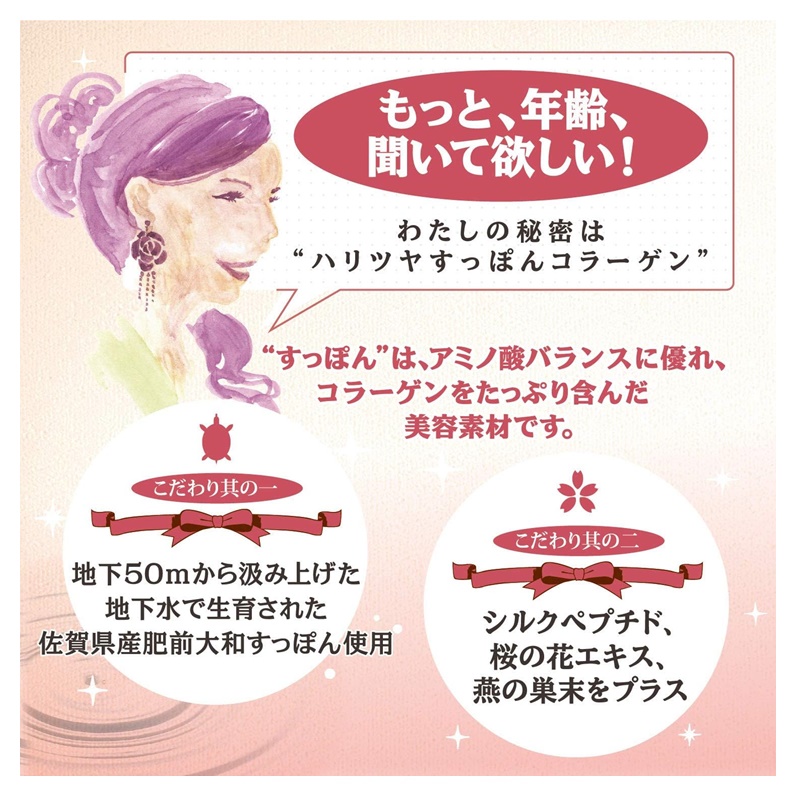 素材にこだわり佐賀県産の肥前大和すっぽんに、シルクペプチド、桜の花エキス、雀の巣などを配合した食品です。
