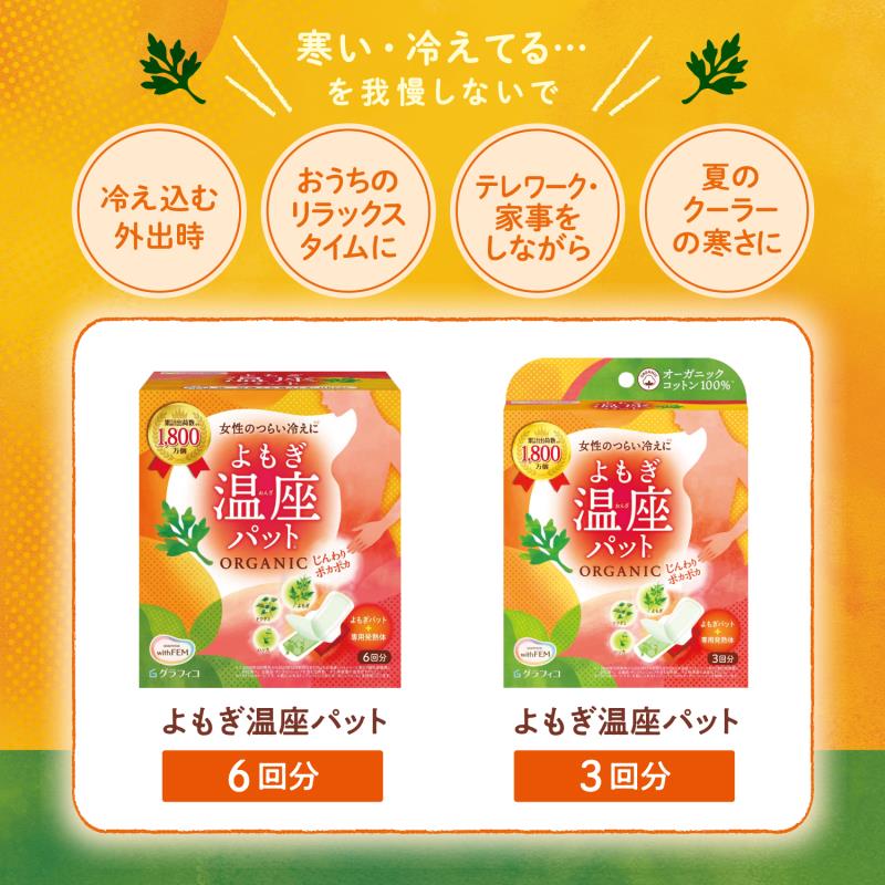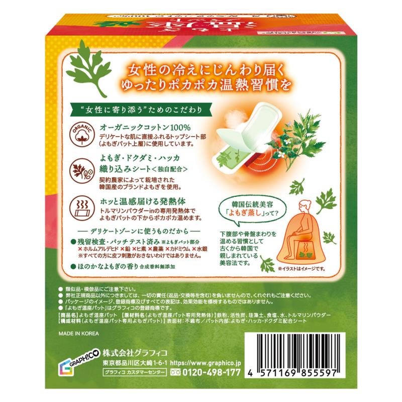 ●女性の冷えにじんわり届く、韓国産よもぎとドクダミ・ハッカが配合された女性のためのナプキン型温熱パットです。