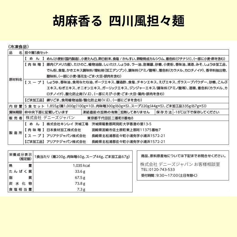 麺(200g)×5食、肉味噌(60g)×5袋、スープ(44g)×5袋、ごま加工品(67g)×5袋