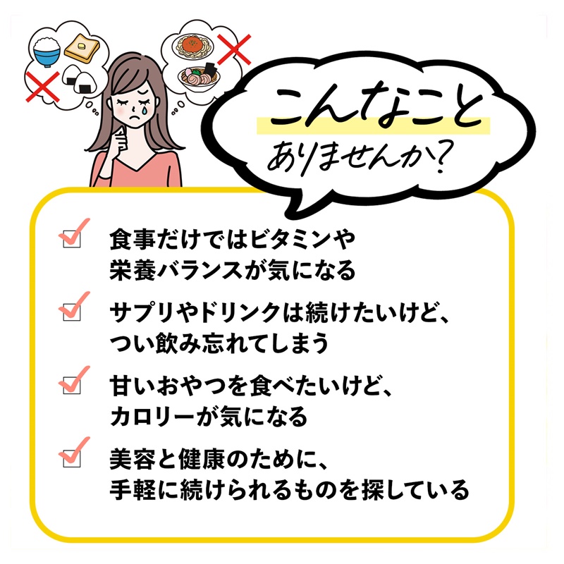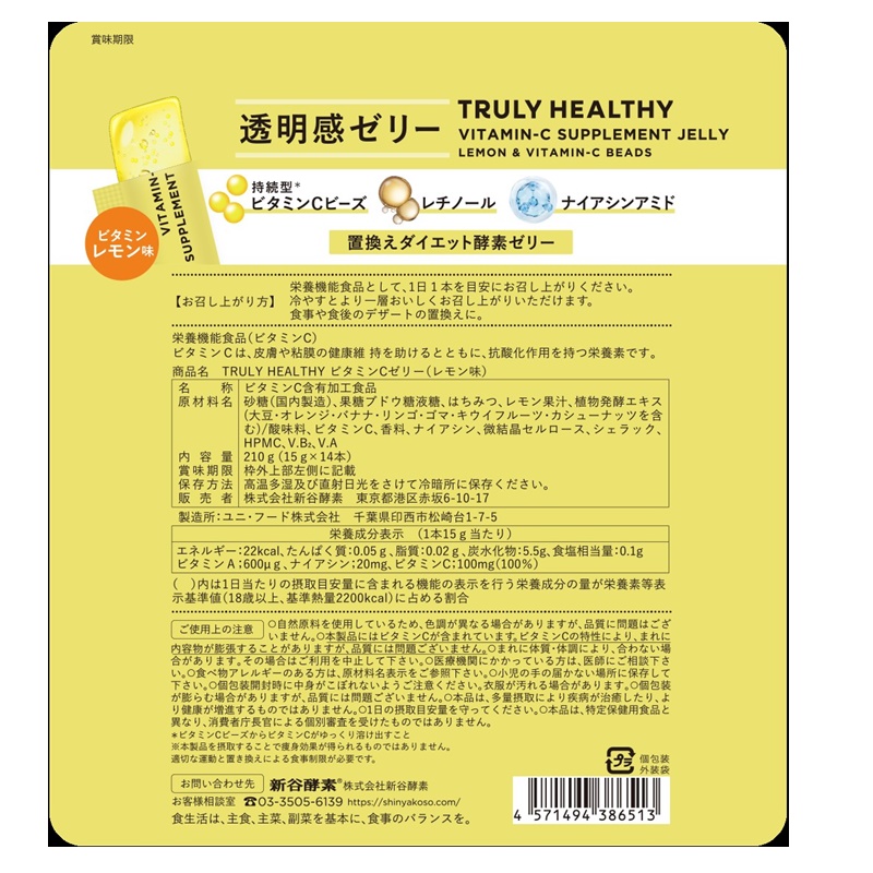 持続型ビタミンCに加え、ナイアシンアミド・レチノール・80種の酵素を配合した、美容にうれしいサプリメント型ゼリーです。