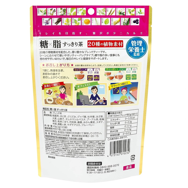- 烏龍茶、はと麦、どくだみ、グァバ葉、杜仲葉、はぶ茶、大麦、山査子、ギムネマシルベスタ、プーアル茶、乾燥葛花、乾燥ごぼう、