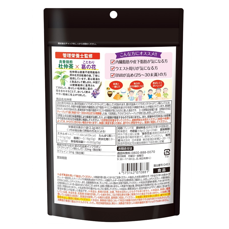 杜仲茶として日本初の、肥満気味な方のお腹の脂肪を減らすのを助ける葛の花由来イソフラボン(テクトリゲニン類として)を配合し