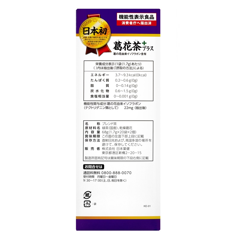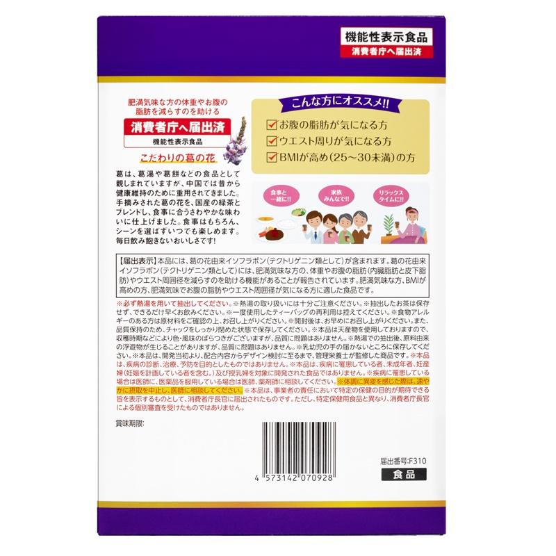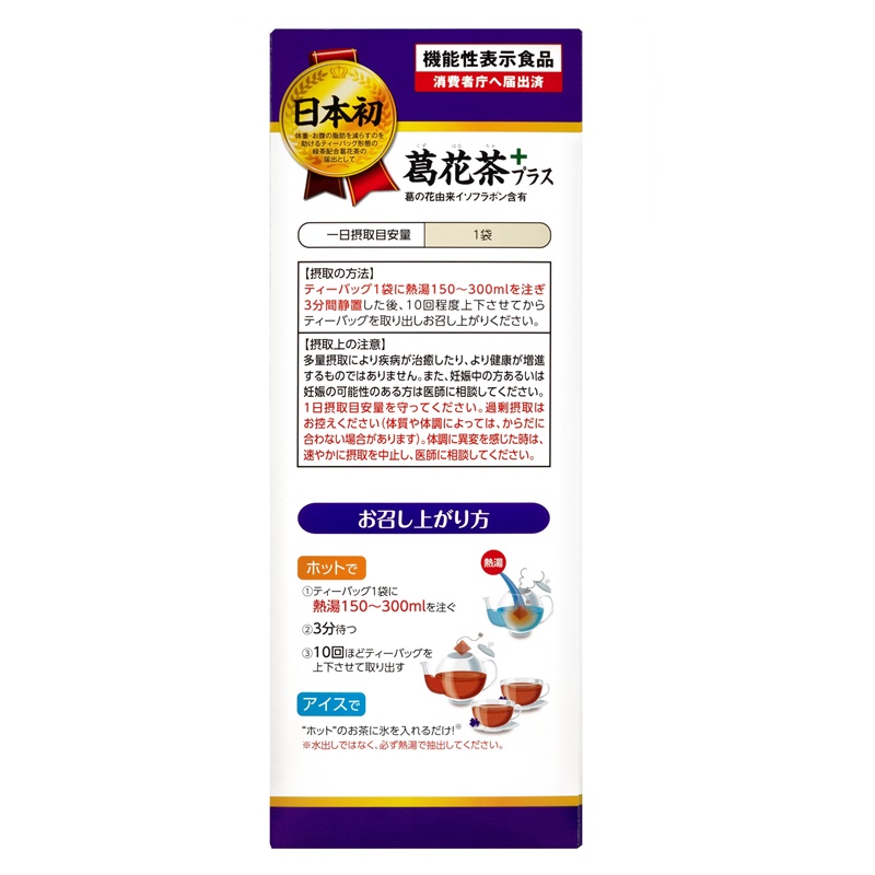 体重やお腹の脂肪を減らすのを助けるティーバッグ形態の緑茶配合葛花茶の機能性表示食品です。
