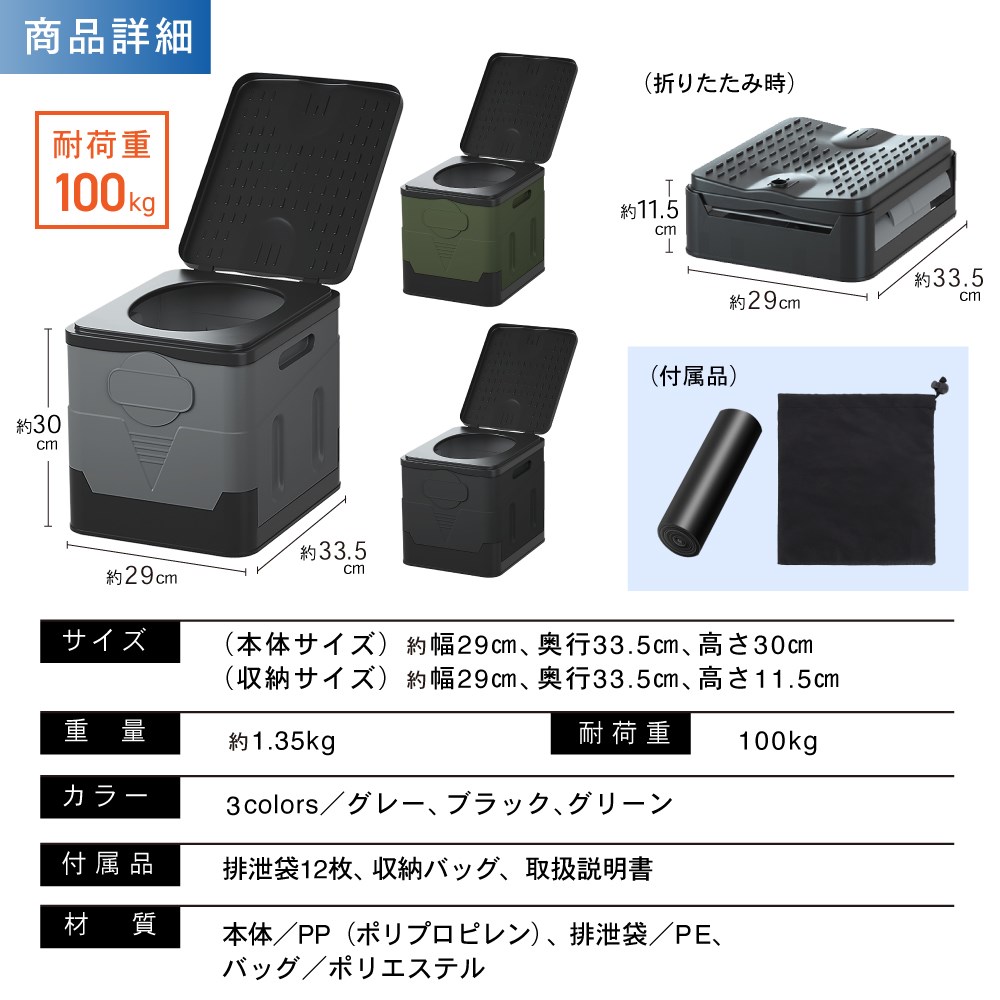 プラスチック製の組み立て式の簡易トイレで、凝固剤12ケ・排泄袋12袋・収納袋が付属している便利なセット。