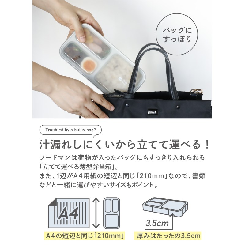 フードマンはそんなバッグにもすっきり入れられる「立てて運べる薄型弁当箱」。