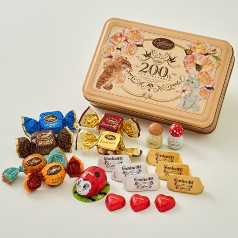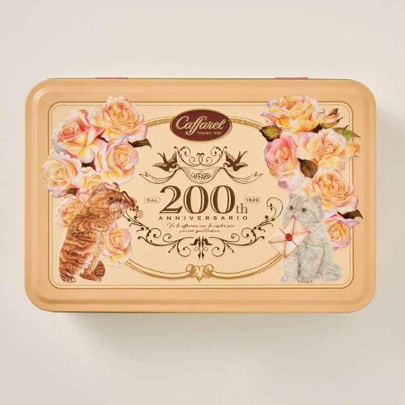 カファレルイラストの猫達が手紙を準備をしているシーンが華やかな缶。