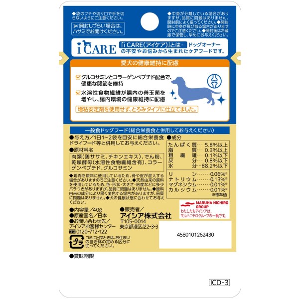 - 肉類(鶏ササミ、チキンエキス)、でん粉、乾燥酵母(水溶性食物繊維含有)、コラーゲンペプチド、グルコサミン