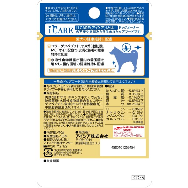 - 肉類(鶏ササミ、チキンエキス)、でん粉、乾燥酵母(水溶性食物繊維含有)、コラーゲンペプチド