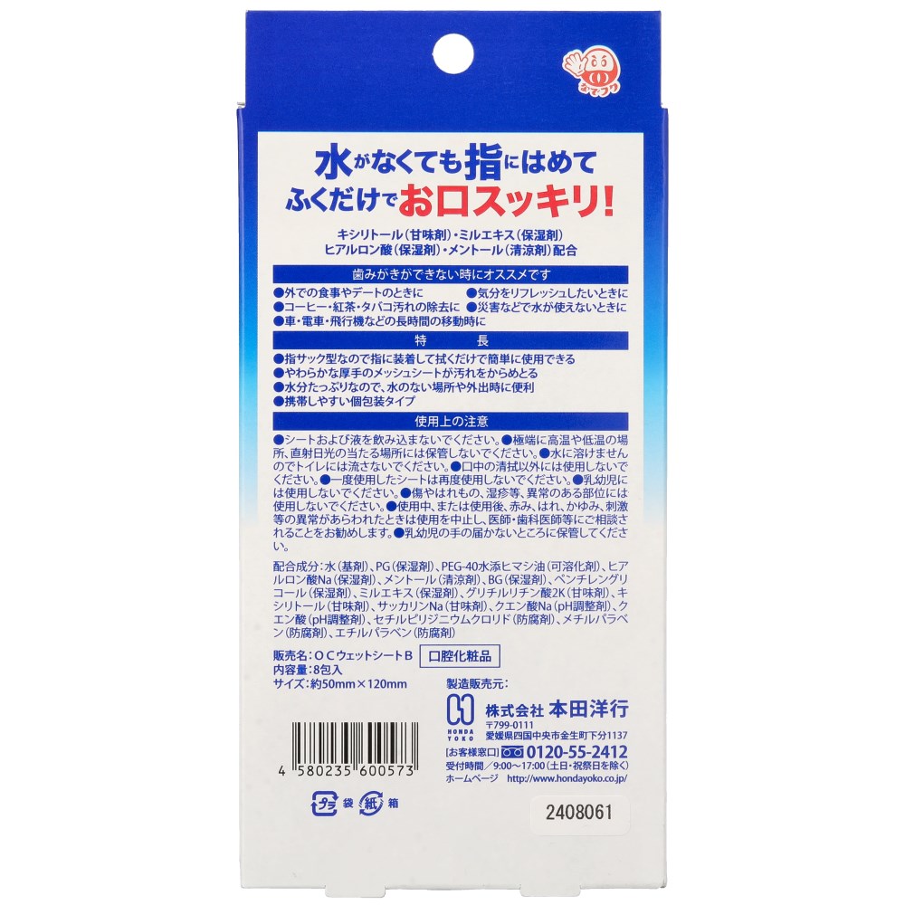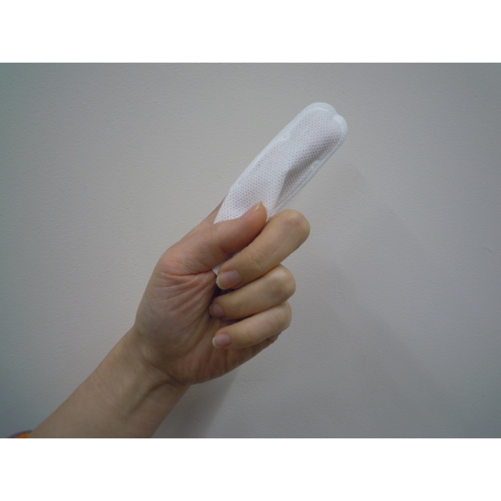 指にはめて口の中を拭くだけで使用できる。携帯しやすい個装タイプ。