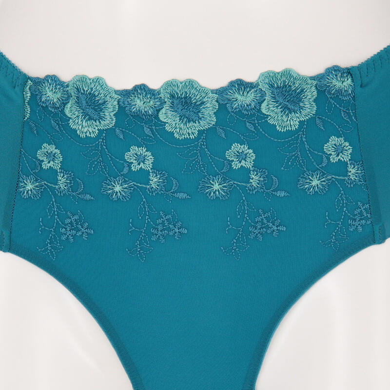 前身に花柄チュールレースをデザイン。足口はなみなみカットのシームレスでアウターにひびきにくいショーツです。生地の伸びが良くお尻にフィットします。