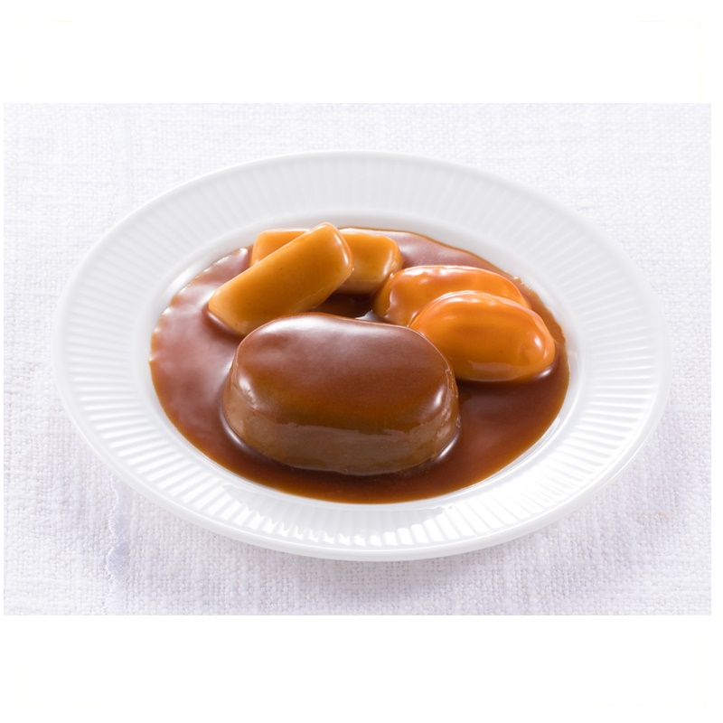 やわらかいムースに仕上げた、大きなハンバーグにじゃがいもムース、にんじんムースを添え、コクのあるデミグラスソースで仕上げ