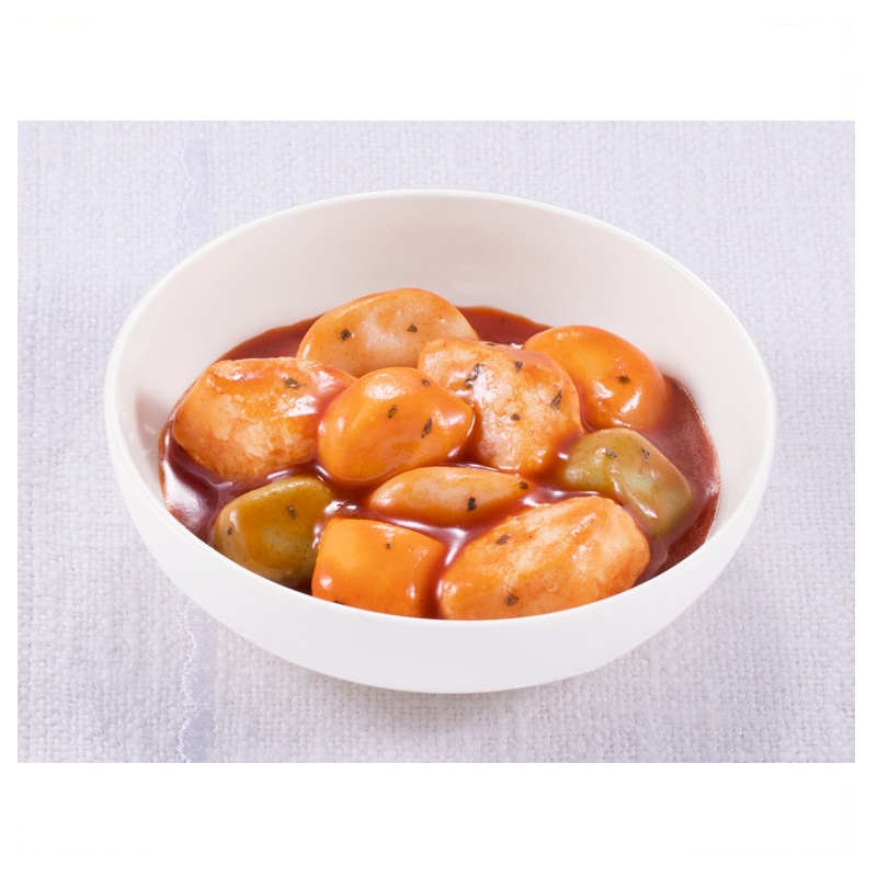 やわらかいムースに仕上げた鶏肉、にんじん、たまねぎ、ピーマンを、バジルの効いたトマトソースで仕上げました。