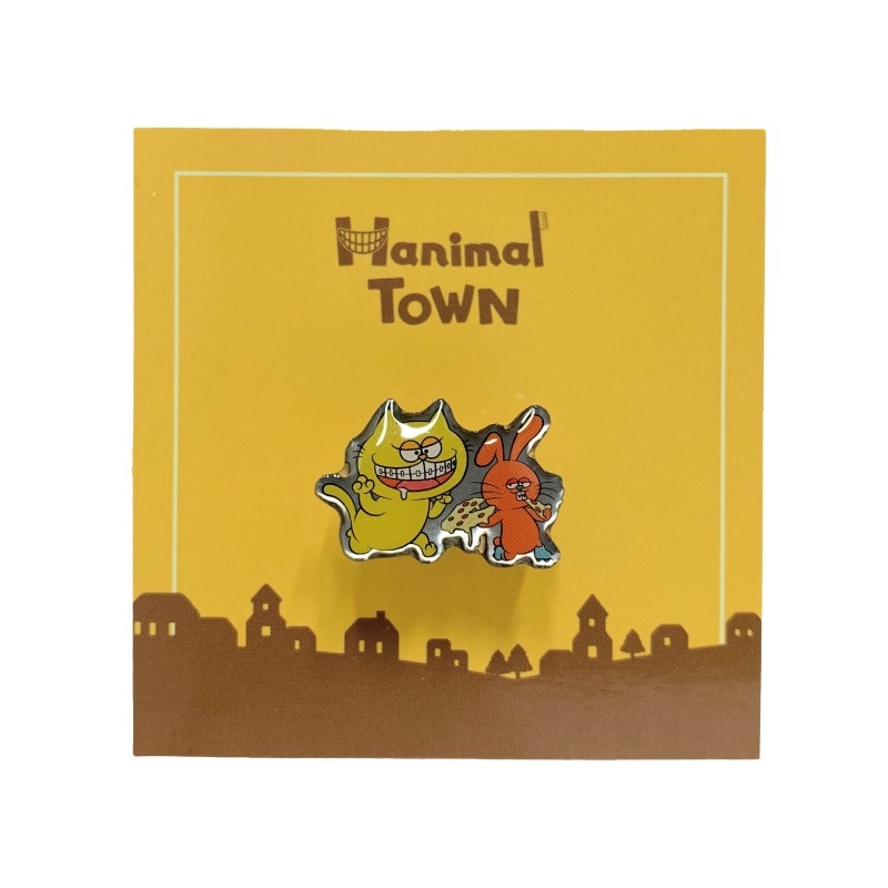 ピザを持って追いかけっこしている可愛らしいピンバッジです
