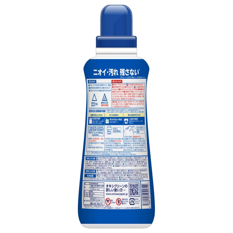 ●液体だから冷水でも溶け残らず色柄物にも使える、さらに進化したオキシクリーンです。