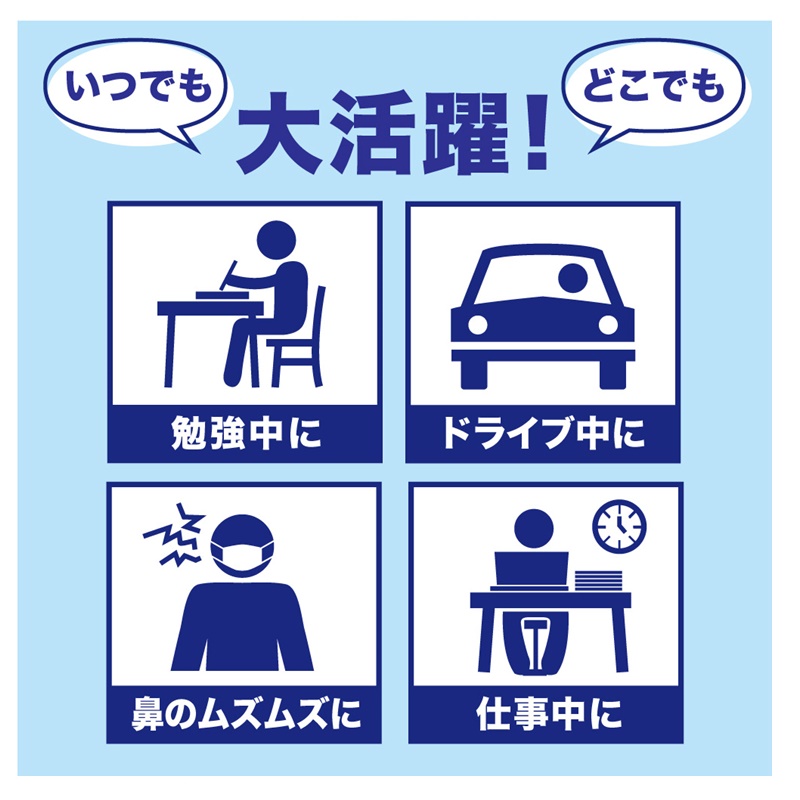 鼻のムズムズを感じた時や、仕事中や勉強中、運転中などの気分転換に役立つフレッシュアイテムです。