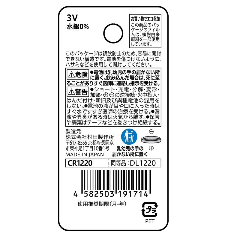 - 負極:リチウム 正極:二酸化マンガン ※環境負荷物質の水銀、鉛、カドニウムなどの重金属は含まれない。