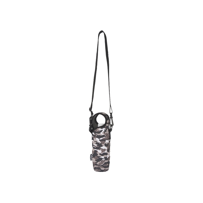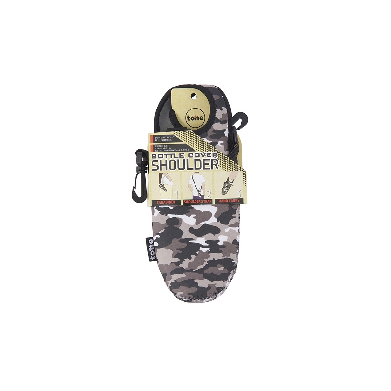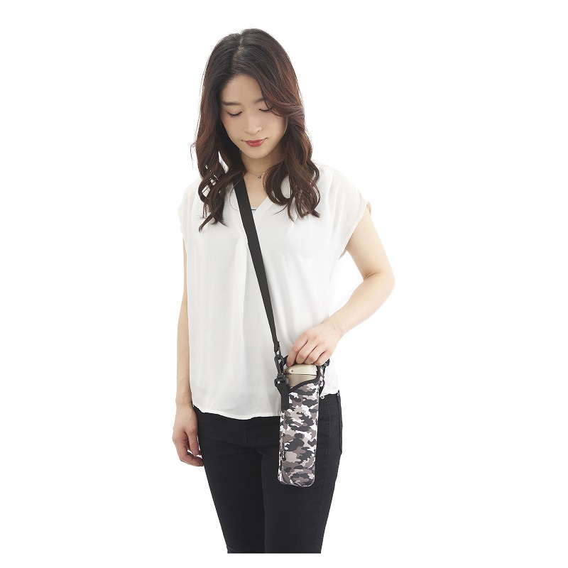 持ち歩きに便利なショルダーストラップ付のボトルカバー。ストラップを外しても便利に使えるフック付き。