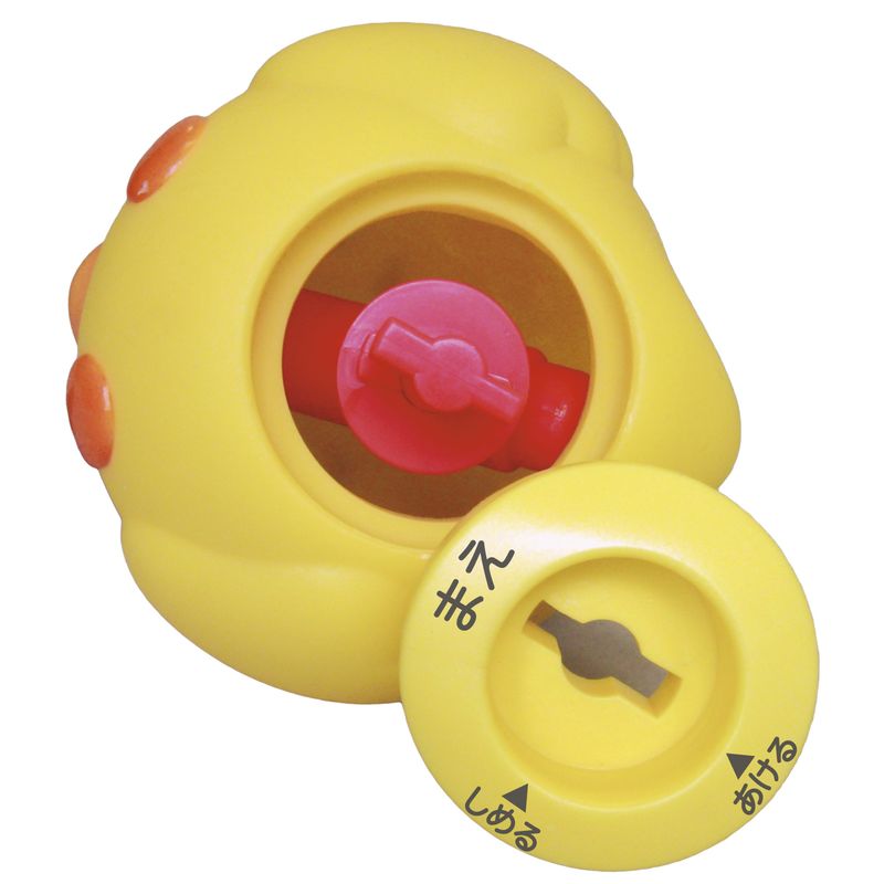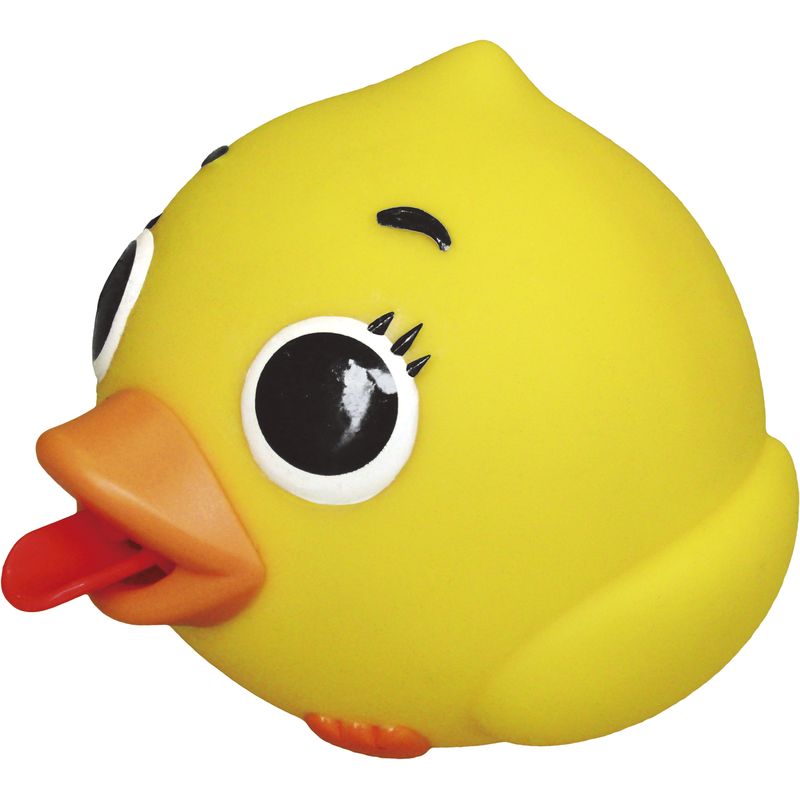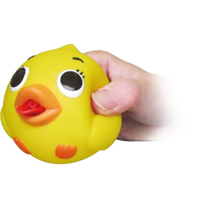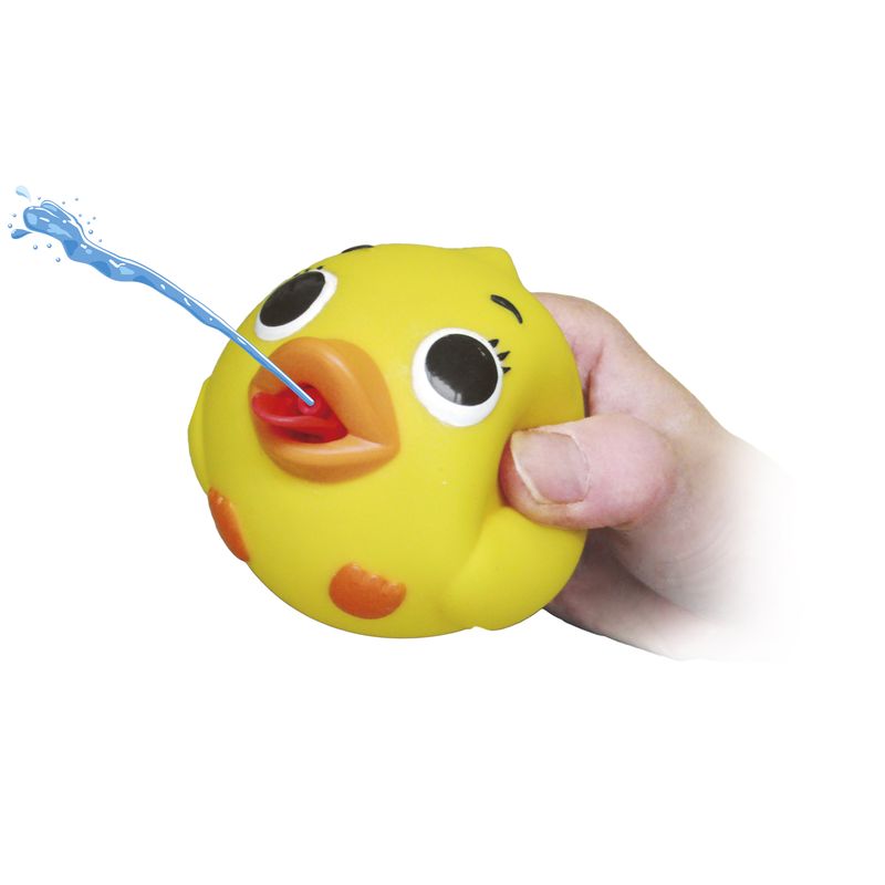 にぎると鳴く動物ボールシリーズに、お風呂で遊べるアヒルが仲間入り。体を押すと下を出して鳴きながら水をふきます。