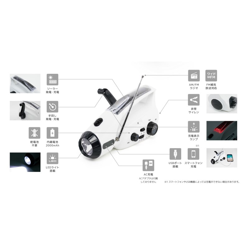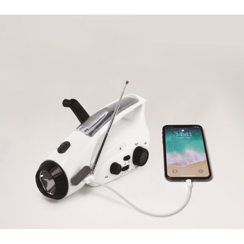 2000mAhバッテリー内蔵多機能型ラジオライトUSB・手回し・ソーラー充電対応