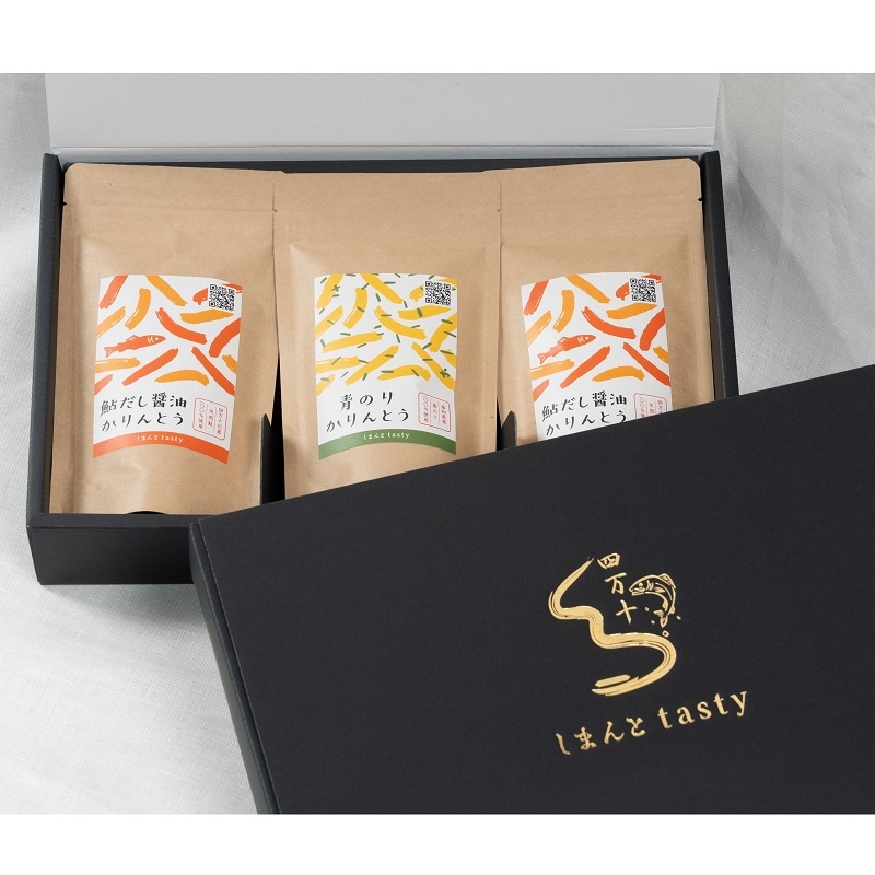 四万十川の素材の旨味を感じるかりんとう詰め合わせです。鮎だし醤油かりんとうは、天然鮎の旨味満載、青のりかりんとうは、