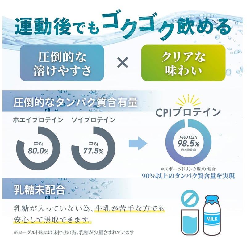 運動後でもすっきりと飲めるクリアな味わいで甘いプロテインが苦手な方にもおすすめです。