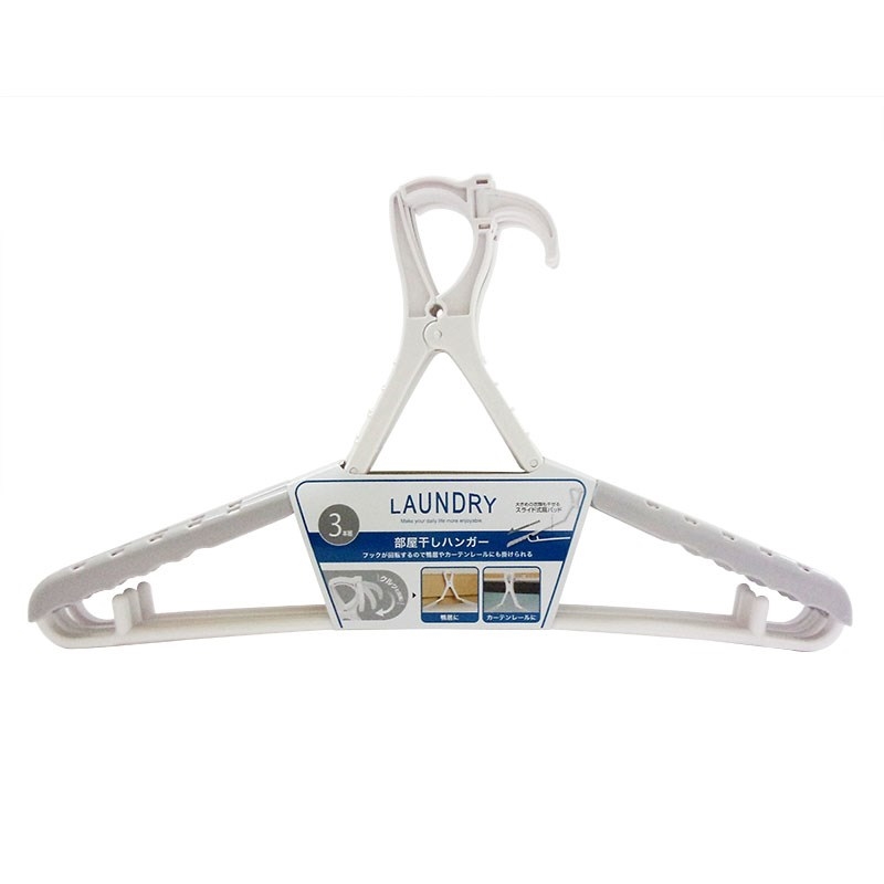 鴨居やカーテンレールに掛けられる回転式のフック付きで、部屋干しに最適です。