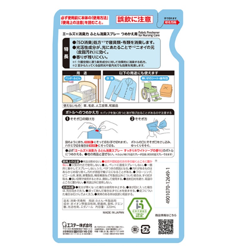 しみつき尿臭に効くクエン酸配合処方で、寝具類を消臭します。