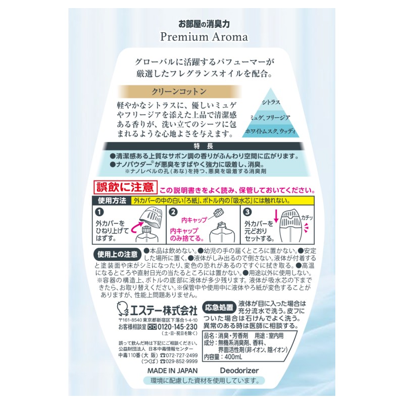 - 無機系消臭剤、香料、界面活性剤(非イオン、陰イオン)