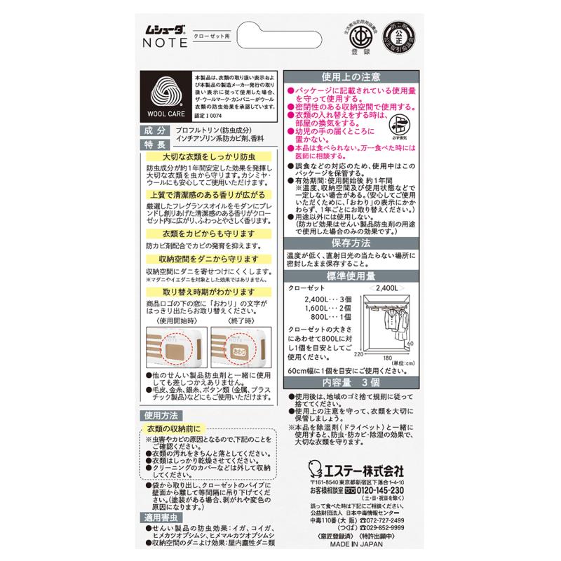 - プロフルトリン(防虫成分)、イソチアゾリン系防カビ剤、香料