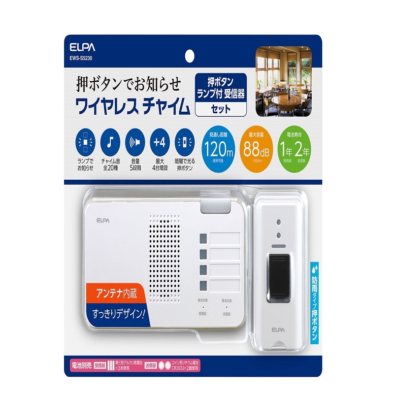 ●電波の到達距離は見通し約120m。一般家庭や店舗、事務所における呼び出しや報知用に最適です。
