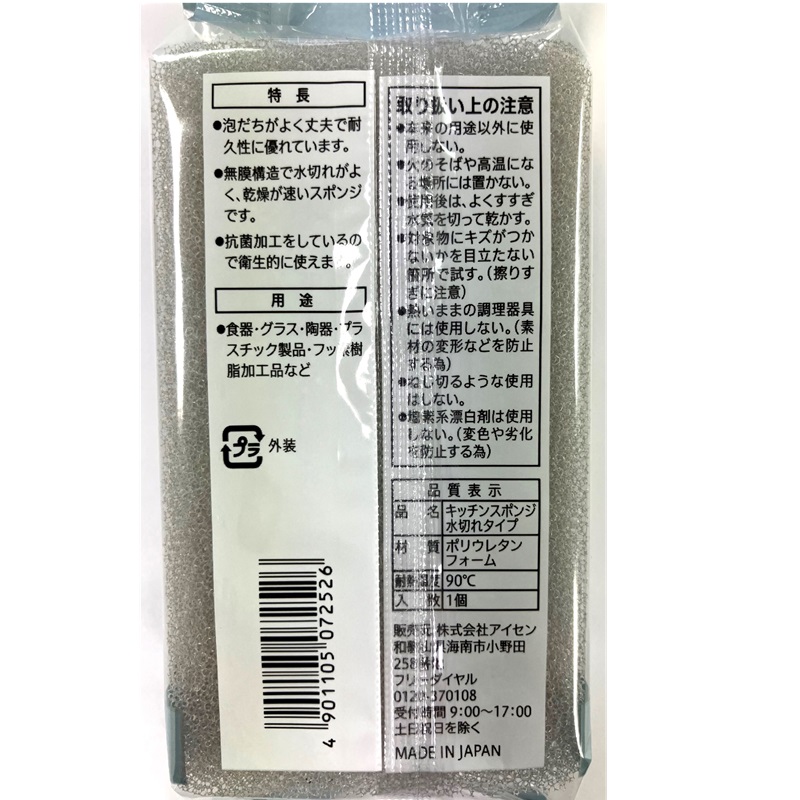 無膜構造で水切れがよく、乾燥が早いスポンジです。
