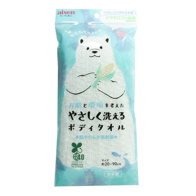 植物由来のデンプンや糖を原料としたポリ乳酸繊維を使ったバイオマスマーク40を取得したボディタオルです。