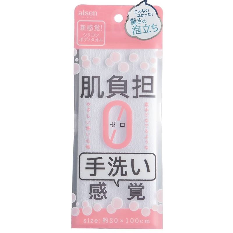 素手でなでるような洗い心地の手洗い感覚ボディタオル。素手では届かない背中もきちんと洗えます。