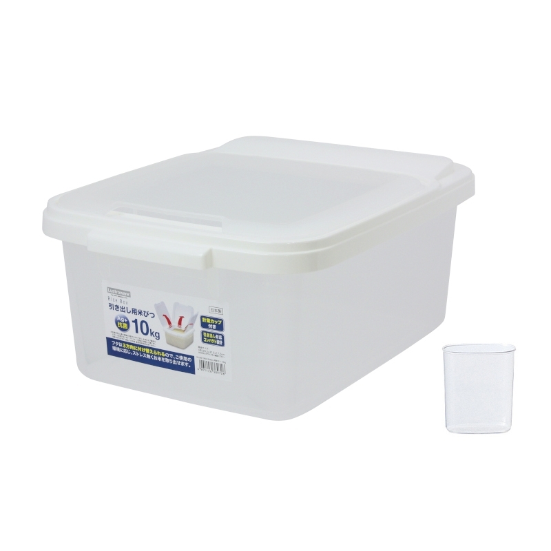 蓋の開閉方向を選べるので、引き出し内でスムーズにお米をとりだす事ができます。 最後まですくいやすい計量カップ付きです。