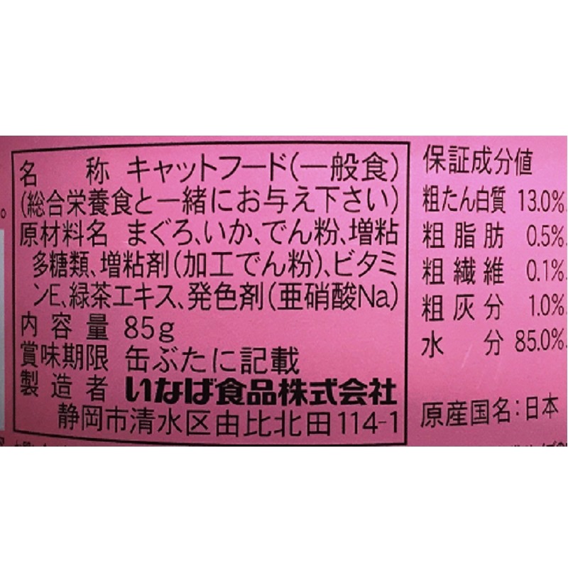 - まぐろ、いか、でん粉、増粘多糖類、増粘剤(加工でん粉)、ビタミンE、緑茶エキス、発色剤(亜硝酸Na)