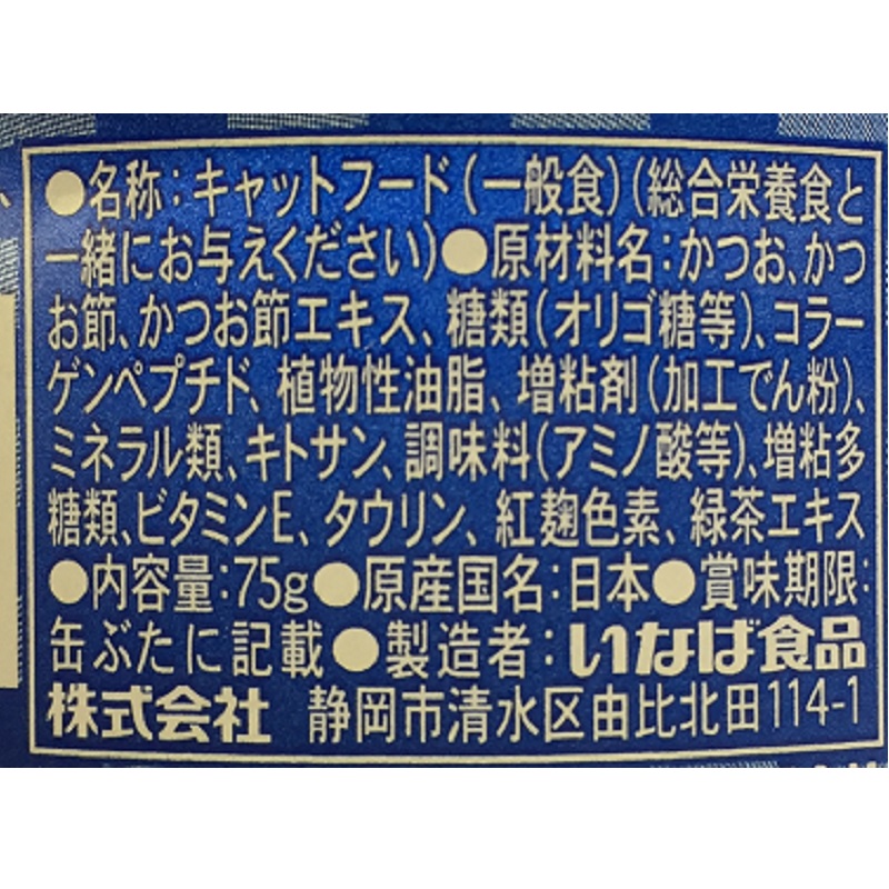 - かつお、かつお節、オリゴ糖、増粘剤(加工でん粉)、増粘多糖類、ビタミンE、タウリン、キトサン、紅麹色素、緑茶エキス