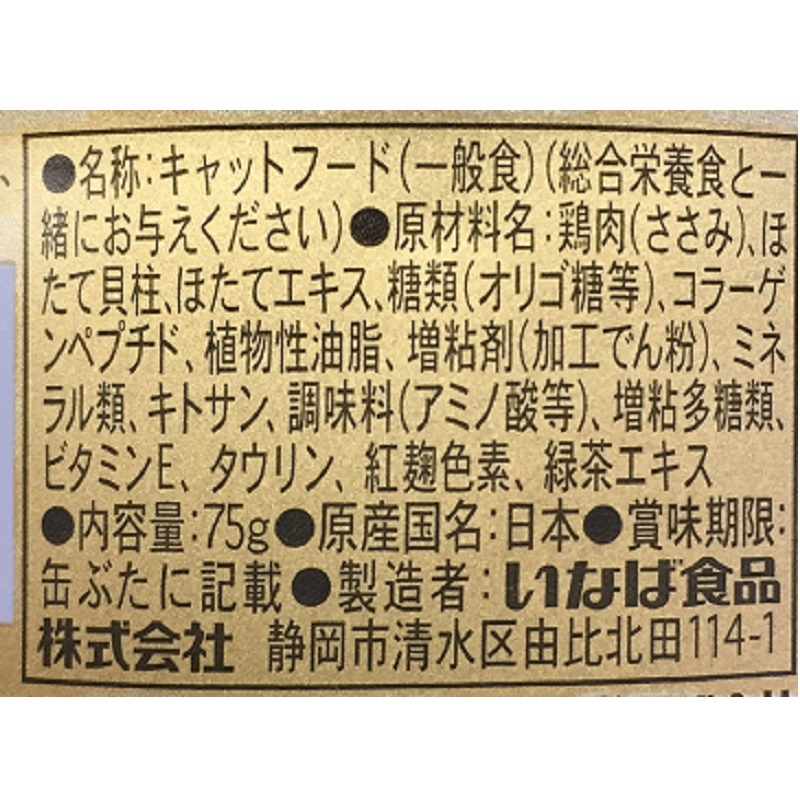 - 鶏肉(ささみ)、ほたて貝柱、オリゴ糖、増粘剤(加工でん粉)、増粘多糖類、ビタミンE、タウリン、キトサン、緑茶エキス